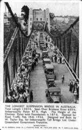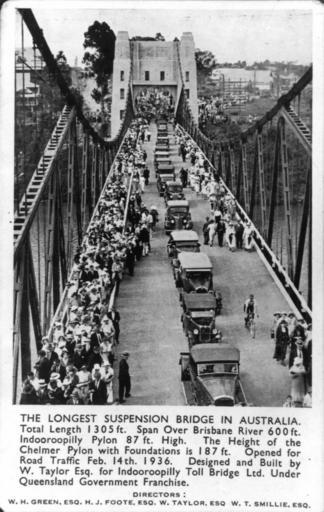 Keywords: StateLibQld 1 54148 Indooroopilly Road Bridge, Brisbane, 1936.jpg en Indooroopilly Road Bridge Brisbane 1936 The Indooroopilly Toll Bridge was seen as advantageous over the contemporary Council Vehicular Ferry in terms of both its time-saving ability and its capacity to generate greater income A suspension type bridge was chosen as the most suitable for the site as there was no necessity for river piers eliminating the danger from flood waters and its stability would not be affected by any debris collected from the adjacent railway bridge Information taken from Indooroopilly Toll Bridge Limited Prosepectus 1931 Caption The longest suspension bridge in Australia Total length 1 305 feet Span over Brisbane River 600 feet Indooroopilly pylon 87 feet high The height of the Chelmer pylon with foundations is 187 feet Opened for road traffic February 14th 1936 Designed and built by W Taylor Esq for Indooroopilly Toll Bridge Ltd under Queensland Government franchise Directors W H Green Esq H J Foote Esq W Taylor Esq W T Smellie Esq This image depicts the foot and vehicular traffic that crowded the bridge on its opening day 1936-02-14 handle 10462/deriv/60393 Item is held by John Oxley Library State Library of Queensland PD-Australia StateLibQld-License Automobiles of Australia Crowds in Australia 1936 in Brisbane Black and white photographs of Australia in the 1930s Walter Taylor Bridge Bridges in Australia photographed in 1936 |