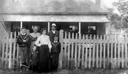 Keywords: StateLibQld 1 55188 Judge Lukin's house at Leyburn, Queensland, ca. 1910.jpg en Judge Lukin's house at Leyburn Queensland ca 1910 Family group standing in front of Judge Lukin's house at Leyburn The brick and tile residence was built in the 1860's for the then Police Magistrate George Lional Lukin Mr Lukin was a resident in Leyburn between 1868 and 1873 Pictured is the family of perhaps a subsequent Magistrate The image includes three children and two women wearing lace collars The family stand in front of a picket fence circa 1910 handle 10462/deriv/61353 Item is held by John Oxley Library State Library of Queensland PD-Australia StateLibQld-License Brick houses in Queensland Children of Queensland Picket fences in Queensland Houses in Leyburn Black and white photographs Families of Queensland |
