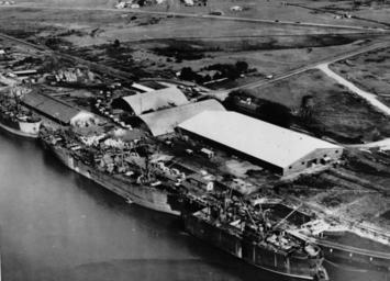 | Keywords: StateLibQld 1 74921 Aerial view of Pinkenba wharf, 1945.jpg en Aerial view of Pinkenba wharf 1945 Looking down on the wharf area There are three ships moored at the docks and various storage sheds surround the area Rural landscape can be seen beyond the immediate wharf area 1945-12-01 handle 10462/deriv/87871 Item is held by John Oxley Library State Library of Queensland Contributor s Queensland Newspapers Pty Ltd PD-Australia StateLibQld-License Black and white photographs Pinkenba Wharf Images from the State Library of Queensland 1945 in Queensland Views of Brisbane Ships in Brisbane |