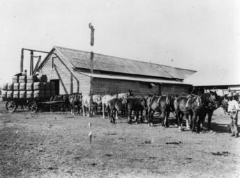 | Keywords: StateLibQld 1 76046 Loading wool bales at the Jimbour woolshed, Darling Downs, Queensland, ca. 1909.jpg en Loading wool bales at the Jimbour woolshed Darling Downs Queensland ca 1909 In the early days at Jimbour Station property was one of the largest properties and was taken up in the 1840s The pastoral run name was first used by Henry Dennis the pastoralist in 1841 The woolshed was built to shear up to 250 000 sheep circa 1909 handle 10462/deriv/139734 Item is held by John Oxley Library State Library of Queensland PD-Australia StateLibQld-License Manual workers of Australia Sheep shearing in Australia Shearing sheds in Australia Sheep and cattle stations in Queensland Wool bales Wool wagons in Australia Black and white photographs |