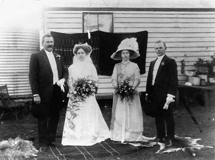 | Keywords: StateLibQld 1 76246 Herman Lindemann and Esta Jensen's wedding in Lowood, Queensland, 1912.jpg en Herman Lindemann and Esta Jensen's wedding in Lowood Queensland 1912 Esta Jensen married Herman Lindemann and her attendant was Elvira Jensen The bride wore a wedding dress and veil and her sister Elvira wore a large picture hat Her brother Arthur Jensen is on the right of the photograph 1912-07-17 handle 10462/deriv/139817 Item is held by John Oxley Library State Library of Queensland Williams H O PD-Australia StateLibQld-License Brides of Australia Bridesmaids of Australia People with hats People with gloves in Australia Grooms of Australia Wedding dresses in Australia Flower bouquets in Australia Veils in Australia Men's clothing of Australia Wedding parties Lowood Queensland 1912 in Australia Black and white photographs |