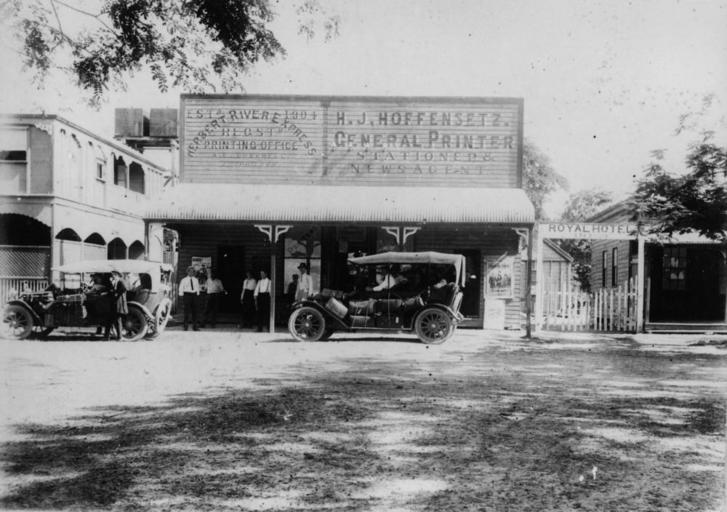 Keywords: StateLibQld 1 90636 Newspaper offices of the Herbert River Express, Ingham, Queensland, ca. 1919.jpg en Newspaper offices of the Herbert River Express Ingham Queensland ca 1919 Touring cars heavily loaded with luggage are waiting outside the Herbert River Express offices The journalists in shirt-sleeves are outside the newspaper office The newspaper offices adjoin a walkway to the Royal Hotel circa 1919 handle 10462/deriv/66148 Item is held by John Oxley Library State Library of Queensland PD-Australia StateLibQld-License Automobiles of Australia Journalists from Australia Newspaper buildings in Australia Ingham Queensland Black and white photographs Newspapers of Queensland