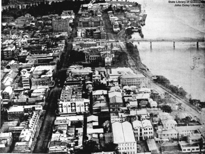 Keywords: StateLibQld 1 92468 Aerial view of George Street, Brisbane, 1923.jpg en Aerial view of George Street Brisbane 1923 Aerial view of Brisbane looking along George Street towards Parliament House in 1923 Victoria Bridge can be seen crossing the Brisbane River on the right and McDonnell and East Ltd is prominent towards the bottom right of George Street 1923 handle 10462/deriv/70719 Copied and digitised from an image appearing in The Queenslander 22 December 1923 p 25 PD-Australia StateLibQld-License Aerial photographs of Brisbane George Street Brisbane 1923 in Brisbane Black and white photographs McDonnell East Ltd Building |