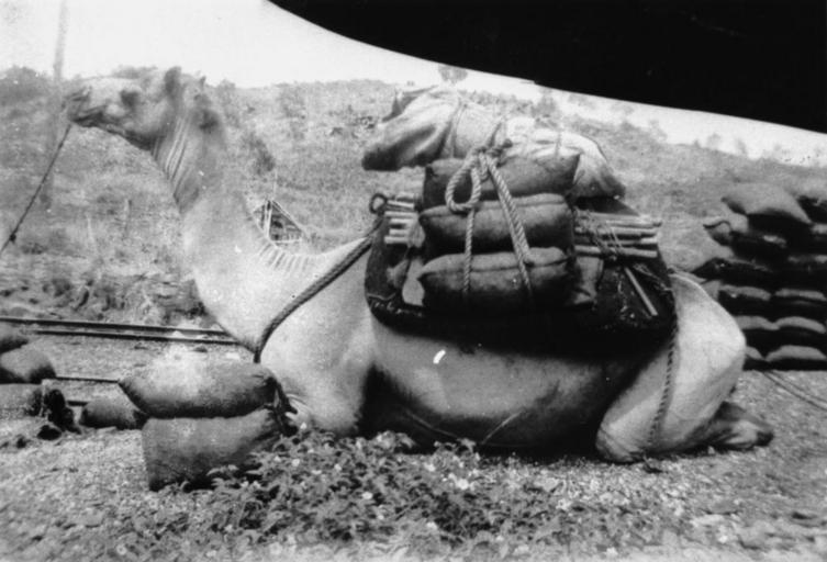 Keywords: StateLibQld 2 126379 Camel taking first ore in sacks to Cloncurry, 1932.jpg en Camel taking first ore in sacks to Cloncurry 1932 First ore being taken to Duchess near Cloncurry The camel is resting under a shade 1932 handle 10462/deriv/80799 Item is held by John Oxley Library State Library of Queensland Plass L PD-Australia StateLibQld-License Black and white photographs Mount Isa Queensland Camels in Australia 1932 in Queensland Sacks Ores |