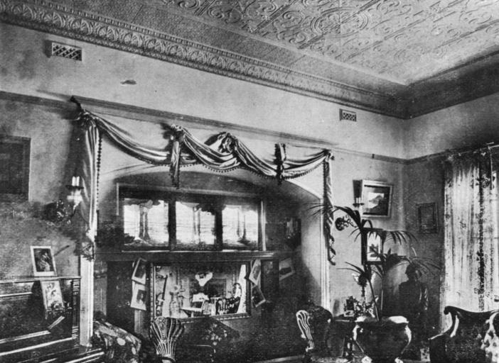 | Keywords: StateLibQld 2 15946 Drawing room in a private residence, featured in a magazine, 1906.jpg en Drawing room in a private residence featured in a magazine 1906 The drawing room has a pressed tin ceiling There is a large potted palm in the corner by the window A feature piece of furniture stands in the centre of the wall decorated with swags draped overhead 1906 handle 10462/deriv/434 Item is held by John Oxley Library State Library of Queensland PD-Australia StateLibQld-License Interior decoration in Australia Black and white photographs Furniture in Australia Pressed tin ceilings 1906 in Queensland |