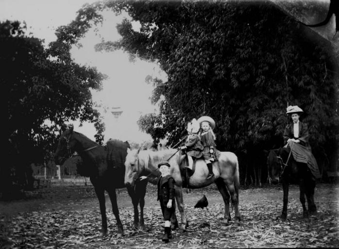 Keywords: StateLibQld 2 160928 Women and children riding horses, 1900-1910.jpg en Women and children riding horses 1900-1910 Two women pose on horses and accompany two girls who share a horse and a boy who holds the bridle One woman wears a hat blouse and skirt and the other woman and the girls wears hats and dresses The boy wears a cap jacket and short trousers The group poses in front of some overhanging trees A chicken forages on the ground between 1900 1910 handle 10462/deriv/8360 Item is held by John Oxley Library State Library of Queensland PD-Australia StateLibQld-License Equestrian sports in Australia Groups of people in Australia 1900s in Australian society Black and white photographs Recreation in Australia Children of Queensland Clothing of Australia Horses of Queensland Horse riding in Australia Children riding horses |