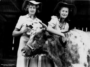 Keywords: StateLibQld 2 161943 Two young women preparing a bull for the Grand Parade of Prize Stock, Mt. Alford, Queensland, 1944.jpg supplied with photograph Two young women prepare a bull for entry in the Grand Parade of Prize Stock Mt Alford One is polishing its horns the other brushing its coat 1944 handle 10462/deriv/110073 Copied and digitised from an original photograph held by the Fassifern and District Historical Society PD-Australia StateLibQld-License Black and white photographs Mount Alford Queensland Farms in Queensland Girls of Australia 1944 in Australia Cattle shows Bulls |