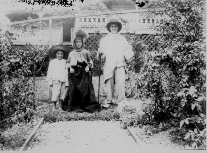 Keywords: StateLibQld 2 164851 Three children in fancy dress, Marlborough, Queensland, 1900-1910.jpg en Three children in fancy dress Marlborough Queensland 1900-1910 Three children in fancy dress on the lawn in front of a house They wear oversize clothes including hats jackets and trousers One child wears a top and a dress and another holds a cane Shrubbery frames is in the foregorund to the left and the right and and the verandah railing of the house can be seen in the background between 1900 1910 handle 10462/deriv/111063 Item is held by John Oxley Library State Library of Queensland PD-Australia StateLibQld-License Groups of people in Australia Black and white photographs Children of Queensland Gardens in Australia 1900 in Australia Marlborough Queensland |