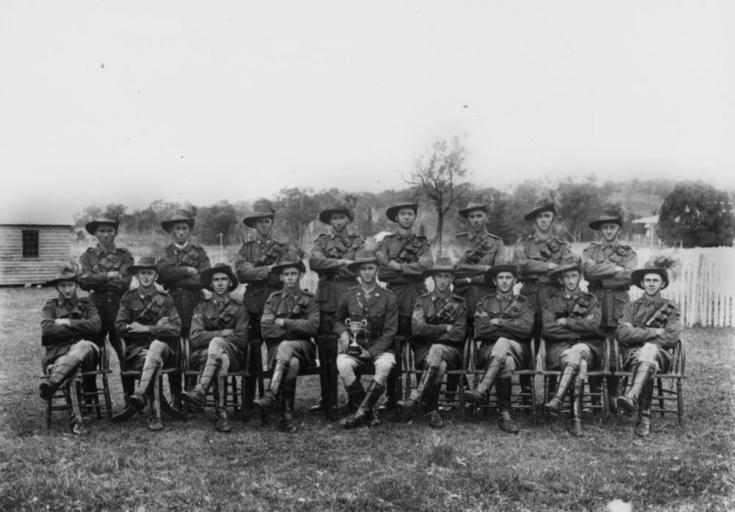 | Keywords: StateLibQld 2 176543 Kilkivan Light Horse Troop displaying the Lord Forster Cup, 1929-1930.jpg en Kilkivan Light Horse Troop displaying the Lord Forster Cup 1929-1930 Front row left to right Trooper E Roberts; Cpl V Wlker; Cpl G Sebbens S Q M ; Sgt T G Hadland; Lieut A J Batts; Sgt G McKell; Cpol G Ray; TrooperE Scott; Trooper J Muir Back row left to right Tpr T Dakin; Tpr W Scott; Tpr R Perarson; Tpr H Mengel; Trp J McLachlan; Tpr C Wex; Tpr F Godber; Tpr T Embery between 1929 1930 handle 10462/deriv/101488 Item is held by John Oxley Library State Library of Queensland Contributor s Murray PD-Australia StateLibQld-License Military uniforms of Australia Black and white photographs Riding boots in Australia Australian Light Horse Soldiers of Australia Kilkivan Queensland 1929 in Australia Australian Army Cups |