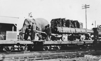| Keywords: StateLibQld 2 185639 Circus moving by train somwhere in Queensland, 1920s.jpg en Circus moving by train somwhere in Queensland 1920s Two workers can be seen unhitching a railway trolley from a harnessed elephant The unhitched trolley is being placed on top of another railway trolley The trolley is loaded with tent poles and stakes handle 10462/deriv/133874 Item is held by John Oxley Library State Library of Queensland PD-Australia StateLibQld-License Black and white photographs Railway lines in Australia Elephants of Australia Workers in Australia Circus in Australia |