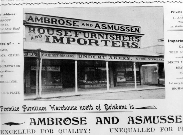 Keywords: StateLibQld 2 202247 Ambrose and Asmussen, Furniture showroom in Gympie in 1903.jpg en Ambrose and Asmussen Furniture showroom in Gympie in 1903 Local furniture warehouse and undertakers in Gympie Gympie is a city in south-eastern Queensland situated on the Mary River about 162 kilometres north of Brisbane Gympie is the centre of an important dairying and agricultural district In the early days timber was a significant industry 1903 handle 10462/deriv/98452 Item is held by John Oxley Library State Library of Queensland PD-Australia StateLibQld-License Furniture shops in Australia Advertisements in Australia Black and white photographs Verandas on Queensland shops Signs in Queensland Buildings in Gympie 1903 in Australia Graphics 1903 advertisements Shop advertising Images from the State Library of Queensland |