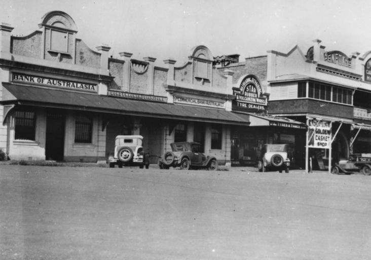 | Keywords: StateLibQld 2 206013 Commercial establishments in King Street, Kingaroy, 1935.jpg en Commercial establishments in King Street Kingaroy 1935 Motor vehicles are angle parked in front of the building housing the Bank of Australasia Bond and Wagner Solicitors and the Commercial Bank of Australia Next door is the Star Rubber tyre dealer and the Carrollee Hotel is on the far right with a Penfold sign above the awning on the building 1935 handle 10462/deriv/128295 Item is held by John Oxley Library State Library of Queensland PD-Australia StateLibQld-License Black and white photographs Vehicles in Australia Advertising signs in Queensland 1935 in Queensland Motor vehicles Streets in Kingaroy Buildings in Kingaroy |