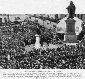 | Keywords: StateLibQld 2 213392 Unveiling a statue of Thomas Joseph Ryan at Queen's Park, Brisbane, 1925.jpg en Unveiling a statue of Thomas Joseph Ryan at Queen's Park Brisbane 1925 Thomas Joseph Ryan 1876-1921 barrister and politician was Queensland Premier 1915 -1919 This image depicts a crowd at the unveiling of his memorial statue in Queen's Park Brisbane Caption Queensland Memorial to T J Ryan The ceremony in Brisbane when a bronze statue by Sir Bertram McKennal to the late Mr T J Ryan formerly Premier was unveiled It is of bronze on a granite base with the pedestal gracefully worked in freeestone and stands at the corner of William and Elizabeth Streets overlooking Queen's Park 1925 handle 10462/deriv/135651 Copied and digitised from an image appearing in Sydney Mail 16 September 1925 Contributor s Sydney Mail PD-Australia StateLibQld-License Black and white photographs Crowds in Australia 1925 in Brisbane Statue of Thomas J Ryan Images from The Sydney Mail Queens Gardens Brisbane |