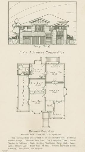 Keywords: StateLibQld 2 228950 Drawing and floor plan of house design no. 47 from the State Advances Corporation, 1934.jpg en Drawing and floor plan of house design no 47 from the State Advances Corporation 1934 The drawing depicts the frontal aspect of the two bedroom plus sleepout house and is accompanied by a floor plan The text reads Design No 47 State Advances Corporation Estimated cost £590 Brisbane 1934 1 380 square feet The following items are provided for in the estimated cost battening between stumps galvanised iron roof one 1 000 gallon tank special flooring to bathroom water service washtubs bath sink washbasin electric light front fence 66 feet polished hardwood floors to lounge dining room and vestibule 1934 handle 10462/deriv/26853 Copied and digitised from an image appearing in Designs of dwellings Queensland State Advances Corporation Brisbane Govt Printer 1935 p 23 PD-Australia StateLibQld-License Public housing in Australia Black and white photographs Architecture of Queensland Houses in Brisbane 1934 in Brisbane |