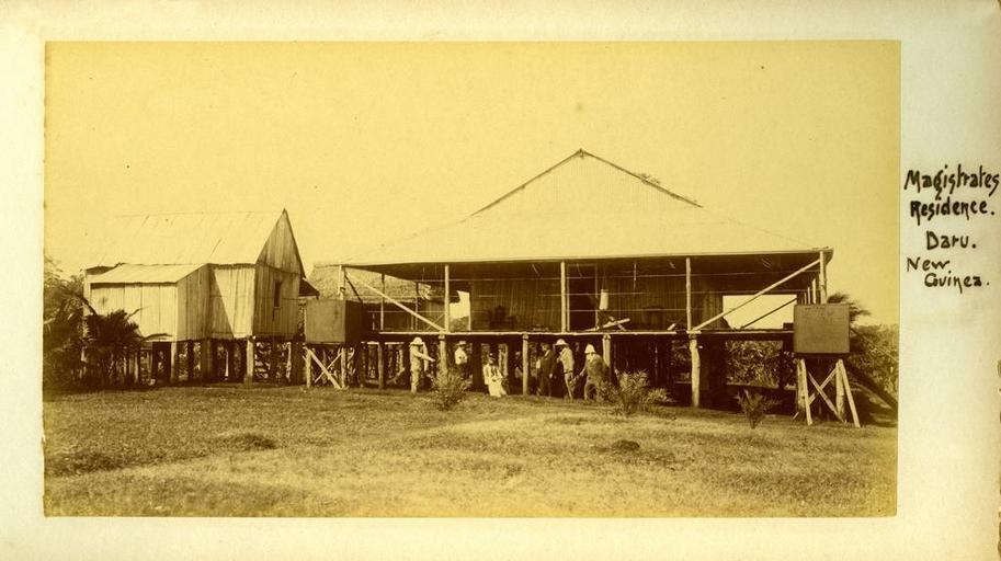| Keywords: StateLibQld 2 231168 Colonial bungalow of the Magistrate of Daru Island, Torres Strait, Papua New Guinea.jpg en Colonial bungalow of the Magistrate of Daru Island Torres Strait Papua New Guinea Wide verandas of the Magistrate's Residence Daru Visitors probably with the Hon J Foxton's party are seated in front of the building Detached huts possibly islanders' residences and kitchen facilities lay to the left of the photograph 1899 handle 10462/deriv/16971 Item is held by John Oxley Library State Library of Queensland Mobsby Henry William PD-Australia StateLibQld-License Women's clothing of Australia Black and white photographs Pith helmets in Australia Huts in Queensland 1899 in Queensland Verandas on single story Queensland houses Domestic rainwater tanks Queensland |