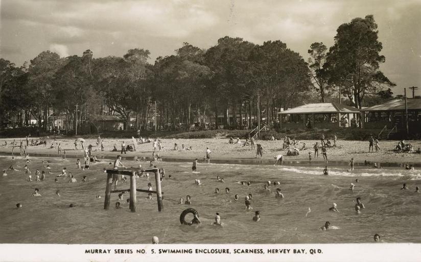 | Keywords: StateLibQld 2 231345 Swimming enclosure at Scarness in the peak holiday season, ca. 1955.jpg en Swimming enclosure at Scarness in the peak holiday season ca 1955 Swimmers in the swimming enclosure at Scarness Harvey Bay The kiosk can be seen in the background of the photograph on the Esplanade This photograph is an original Murray View postcard no 5 circa 1955 handle 10462/deriv/17100 Item is held by John Oxley Library State Library of Queensland Contributor s Murray PD-Australia StateLibQld-License Images of postcards from the State Library of Queensland Outdoor swimming pools in Australia Black and white photographs Swimmers from Australia Buildings in Australia Beaches of Queensland Kiosks People in swimming pools Kiosks in Queensland Murray View postcard series |