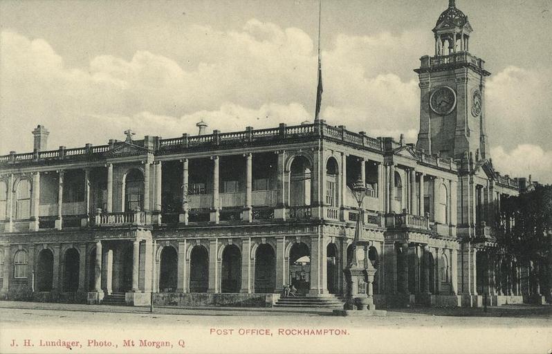 Keywords: StateLibQld 2 237154 Rockhampton Post Office, ca. 1895.jpg en Rockhampton Post Office ca 1895 Rockhampton Post Office was designed by the architect G Connolly and constructed by Collins and McLean in 1895 It was built from Stanwell sandstone The most striking features of the building are the superb colonnades and the imposing clock tower The Post Office is situated on the northwest corner of East Street and Denham Street circa 1895 handle 10462/deriv/38250 Item is held by John Oxley Library State Library of Queensland Lundager J H Jens Hansen 1853-1930 PD-Australia StateLibQld-License Images of postcards from the State Library of Queensland Neoclassical architecture in Australia Black and white photographs Post offices in Queensland Clock towers in Queensland Bell towers in Australia Buildings in Rockhampton Colonnades in Australia Rockhampton Post Office |