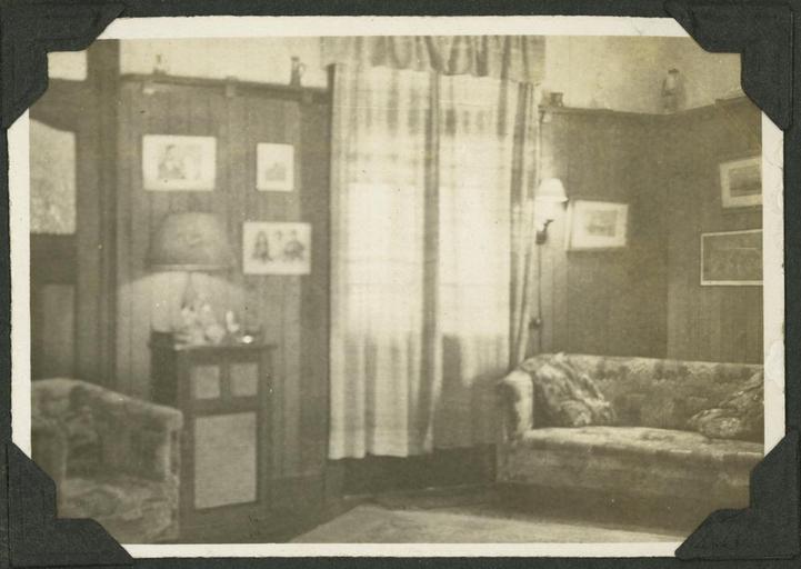 | Keywords: StateLibQld 2 242252 Interior of a lounge room in a Queensland home, 1937.jpg  en Interior of a lounge room in a Queensland home 1937 Inscription under photograph reads 'Bryn-Cefn' probably a residence in Ayr north Queensland The furnishings in the living room include a three-seater sofa uphostered in a woven floral tapestry fabric with an accompanying high backed arm chair in the popular 'tub'style An upright radiogramme in the centre of the photograph has a table lamp on it and matching lampshade The walls of the living room have a wood-panelled bottom section and a picture rail Behind the sofa is a smaller wall-mounted reading lamp The walls are decorated with photographs and prints 1937 handle 10462/deriv/123619 Item is held by John Oxley Library State Library of Queensland PD-Australia StateLibQld-License Building interiors in Queensland Black and white photographs Living rooms in Australia Couches in Australia 1937 in Australia Ayr Queensland |