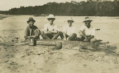 Keywords: StateLibQld 2 245411 Crocodile bagged on the Herbert River.jpg en Crocodile bagged on the Herbert River Unidentified sportmen with a ten foot crocodile Inscription on rear of postcard reads 'Sport on the Herbert ' handle 10462/deriv/119074 Item is held by John Oxley Library State Library of Queensland PD-Australia StateLibQld-License Images of postcards from the State Library of Queensland Black and white photographs Pith helmets in Australia Unidentified Crocodilia Headgear of Australia Hunting in Australia Herbert River