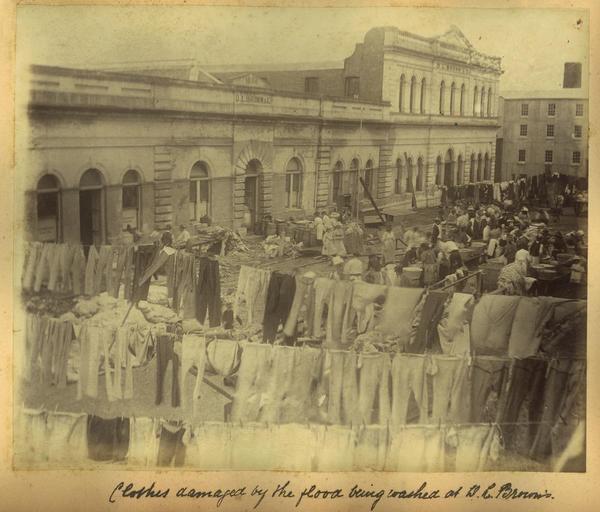 | Keywords: StateLibQld 2 256212 Workers washing clothes damaged in the flood, Brisbane, 1893.jpg  en Workers washing clothes damaged in the flood Brisbane 1893 Workers are outside the D L Brown Co building in Short Street Large tubs of water are spread around the area for people to wash the clothes in There are many lines strung around the yard with clothes pegged out to dry February 4 1893 saw the highest floods on record in Brisbane and elsewhere; 6ft water in Edward Street at the Courier Buildings hundreds of houses washed down river trees uprooted and shipping torn from moorings The Indooroopilly Bridge was washed away and the northern end of Victoria Bridge disappeared Floodwaters rose at Brisbane to 23 feet 9 inches above mean spring tide and 10 feet over the previous highest flood mark 1890 1893 handle 10462/deriv/122577 Item is held by John Oxley Library State Library of Queensland PD-Australia StateLibQld-License Women's clothing of Australia Men's clothing of Australia Black and white photographs Architecture of Australia Laundry equipment Clothes lines 1893 Brisbane flood |