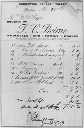 Keywords: StateLibQld 2 389753 Bill of sale from the Brisbane firm T. C. Beirne, 1894.jpg supplied with photograph 1894 handle 10462/deriv/192711 Item is held by John Oxley Library State Library of Queensland PD-Australia StateLibQld-License Brunswick Street Brisbane Black and white photographs 1894 in Queensland Draperies Bills and receipts Shops in Brisbane TC Beirne Department Store |