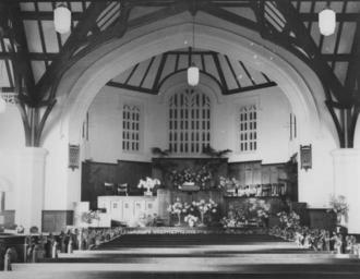 | Keywords: StateLibQld 2 391225 Inside the Methodist Church, Bundaberg, 1937.jpg en Inside the Methodist Church Bundaberg 1937 Christ Church Church of England The first Anglican church was built in Quay Street in 1876 In 1899 the church was shifted to Woongarra Street near the present site The present church was completed in 1927 The church was built in an English gothic style with the characteristic features of pointed arches bell tower and 34 metre spire tower The stone walls surrounding the grounds the lichgate and the wayside cross are in keeping with old English custom 1937 handle 10462/deriv/192216 Item is held by John Oxley Library State Library of Queensland PD-Australia StateLibQld-License Building interiors in Queensland Black and white photographs Churches in Bundaberg Altars in Queensland 1937 in Queensland Church benches |