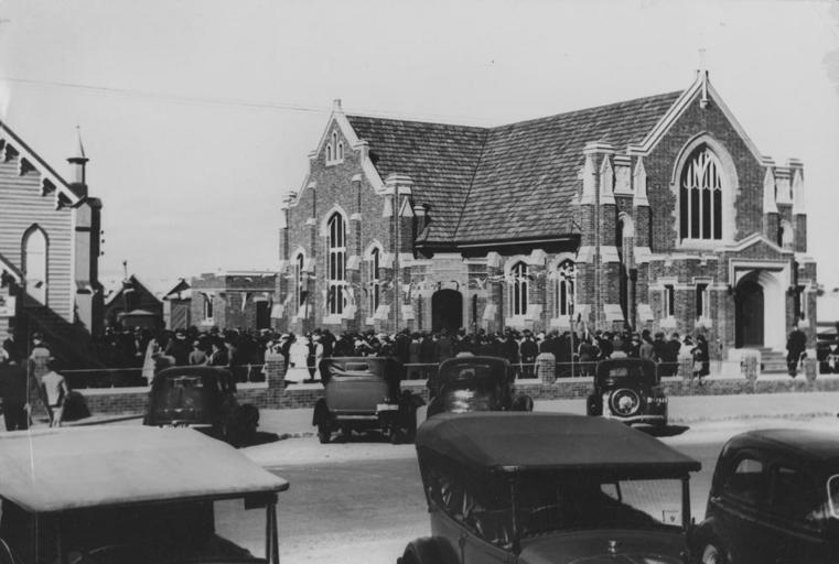 | Keywords: StateLibQld 2 391693 Opening Ceremony of the Methodist Church, Bundaberg, 1937.jpg en Opening Ceremony of the Methodist Church Bundaberg 1937 Christ Church Church of England The first Anglican church was built in Quay Street in 1876 In 1899 the church was shifted to Woongarra Street near the present site The present church was completed in 1927 The church was built in an English gothic style with the characteristic features of pointed arches bell tower and 34 metre spire tower The stone walls surrounding the grounds the lichgate and the wayside cross are in keeping with old English custom 1937 handle 10462/deriv/193560 Item is held by John Oxley Library State Library of Queensland PD-Australia StateLibQld-License Gothic revival churches in Australia Black and white photographs Churches in Bundaberg Vehicles in Australia Opening ceremonies 1937 in Queensland Motor vehicles in Australia |