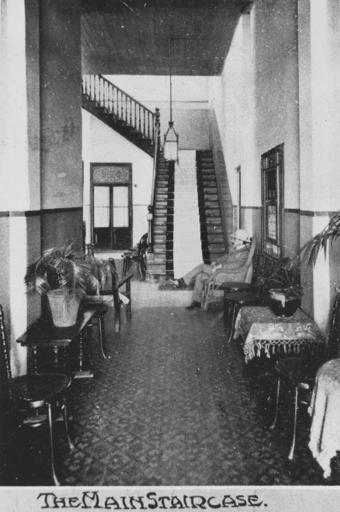 | Keywords: StateLibQld 2 391989 Main staircase, Royal Hotel, Bundaberg, 1907.jpg en Main staircase Royal Hotel Bundaberg 1907 The hall way and the main staircase of the Royal Hotel with a gentleman seated in a cane chair near the foyer area 1907 handle 10462/deriv/193232 Item is held by John Oxley Library State Library of Queensland PD-Australia StateLibQld-License Black and white photographs Hotels and pubs in Bundaberg Stairs in Australia Tables in Australia Chairs in Australia 1907 in Australia |