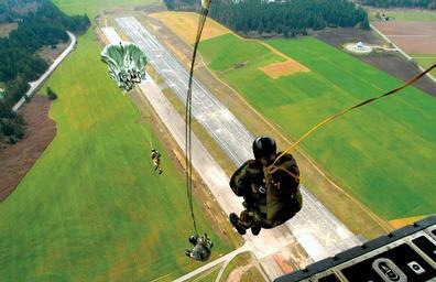 | Keywords: Static jump.jpg w Naval Outlying Field Coupeville Explosive Ordnance Disposal Mobile Unit Eleven EODMU-11 members perform a static jump from the ramp of a C-130 Hercules in groups of three EODMU-11 is flying with the 731st Airlift Squadron and will descend from altitudes ranging from 1 000 to 13 000 feet Their mission is to successfully exit the aircraft using proper parachuting procedures and hit their designated drop zone target Each jumper must go through a series of safety checks before jumping while being instructed by the jumpmaster who is the most qualified jumper aboard the aircraft and the only one who can give the okay to exit the aircraft 040323-N-8921O-004 Navy http //www navy mil/view_image asp id 12908 2004-03-23 Chris Otsen United States Navy PD-USGov-Military-Navy 150px 48 11 28 N 122 37 48 W heading SbW Assessments 1 Parachuting 2 1 Naval Outlying Field Coupeville Challenges to physical balance Static line parachuting Explosive Ordnance Disposal Mobile Unit 11 731st Airlift Squadron United States Air Force Lockheed C-130 Hercules |