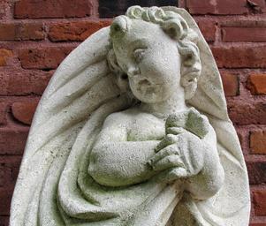 Keywords: statue child close-up stone brick angel angelic gray red weathered infant baby toddler