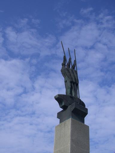 Keywords: statue new ulm sculpture men boot town hall square three men in a boat monument bronze sky blue
