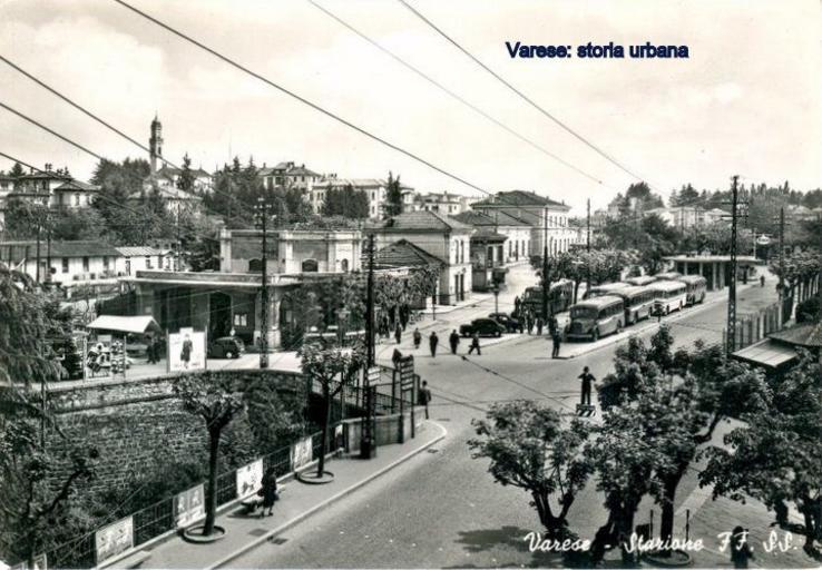 Keywords: La stazione delle Ferrovie dello Stato (1865) vista da via Milano. Sulla sinistra l'edificio poligonale del caffè ristorante Martinelli. varese