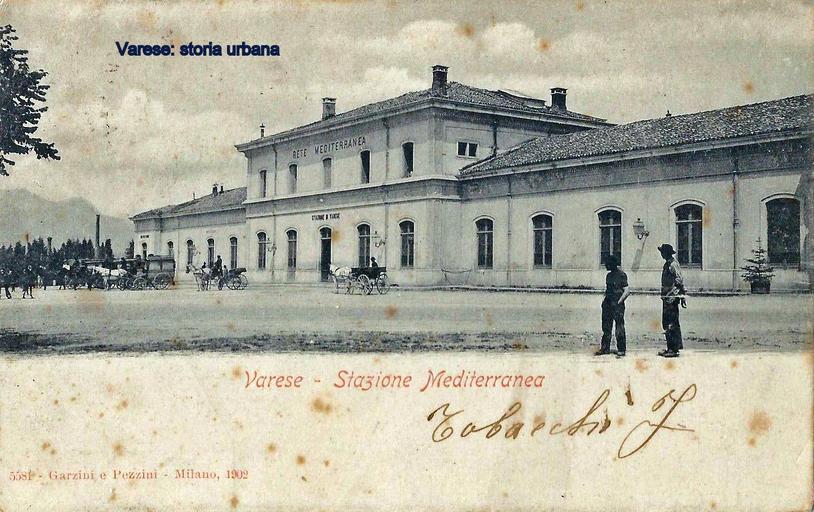 Keywords: L'edificio della stazione (1865) con i vetturini in attesa. A sinistra la ciminiera dei Molini Marzoli Massari. varese