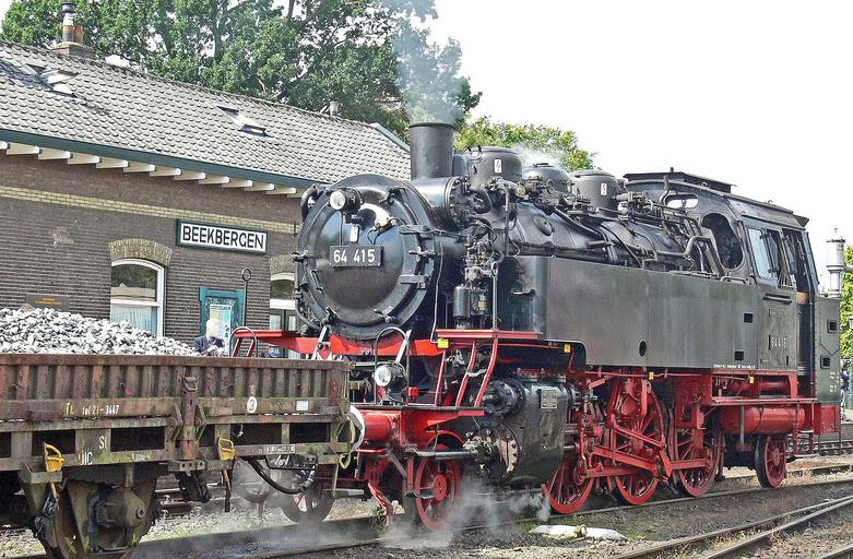 Keywords: steam locomotive tank locomotive baureihe 64 operation of the museum apeldoorn-beekbergen netherlands vsm veluwsche stoomtrein maatschappij active operational under steam gondola cars einheitslok gravel cylinder steam smoke railway historically nostalgia steam water vapor oldtimer