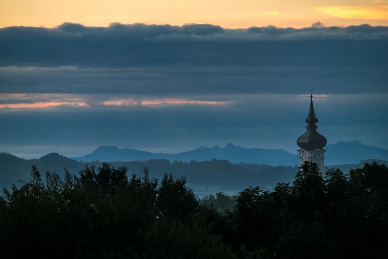 Keywords: steeple fog mountains alpine marie münster hazy haze dießen diessen church germany ammersee forest bavaria