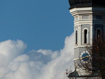 Keywords: steeple ulm holy trinity church spire onion dome church sky clouds cloud mountains white blue tower turrets onion helm great roof faith christianity building architecture