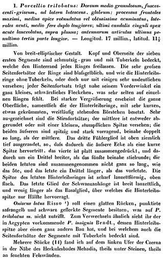 | Keywords: Stein1859 Porcellio trilobatus.png of the species Porcellio trilobatus now Trachelipus trilobatus by J P E Frdr Stein in the 1859 Berliner entomologische Zeitschrift volume 3 pages 260-267 http //www archive org/details/berlinerentomolo31859berl J P E Frdr Stein a k a Samuel Friedrich Nathaniel Stein Czech entomologist 1818-1885 1859 Corrected version of OCRed text 1 Porcellio trilobatus Dorsum medio granulosum fuscescenti-griseum ad latera lutescens glabrum; processus frontales maximi medius apice rotundatus vel obtusissime acuminatus laterales acuti medio fere duplo longiores; ultimi caudalis cinguli apex acute lanceolatus supra planus; antennarum articulus ultimus penultimo tertia parte longior -- Longitud 17 millim latitud 11 5 millim Von breit-elliptischer Gestalt Kopf und Oberseite der sieben ersten Segmente sind schmutzig - grau und mit Tuberkeln bedeckt welche den Hinterrand jedes Ringes freilassen Die sehr groĂen SeitenfortsĂ€tze der Ringe sind blaĂgelblich und wie die Hinterleibsringe ohne Tuberkeln oder doch nur mit einigen sehr undeutlichen versehen; jeder Seitenfortsatz trĂ€gt nahe seinem Vorderwinkel ein ganz kleines schwĂ€rzliches Fleckchen was sehr selten auf einzelnen Ringen fehlt Bei starker VergröĂerung erscheint die ganze OberflĂ€che namentlich die der Hinterleibsringe mit sehr kurzen etwas gekrĂŒmmten weitlĂ€ufig stehenden BĂŒrstchen besetzt Sehr ausgezeichnet sind die StirnfortsĂ€tze; der mittlere ist entweder abgerundet oder mit einer kleinen slumpflichen Spitze versehen; die beiden Ă€uĂeren sind spitzig und stark vorragend beinahe doppelt so lang als der mittlere Das dritte FĂŒhlerglied ist oben ziemlich tief ausgerandet so daĂ dadurch die Ă€uĂere Ecke als eine kurze Spitze hervortritt das vierte ist platt zusammengedrĂŒckt und dadurch um ein Drittel breiter als das fĂŒnfte beinahe stielrunde; die beiden letzten sind zusammengenommen nicht ganz so lang wie das 5te und das letzte ein Drittel lĂ€nger als das vorletzte Die Spitze des letzten Hinterleibsringes ist scharf lanzettförmig oben flach Das letzte Glied der SchwanzanhĂ€nge ist breit lanzettlich und wenig lĂ€nger als das Basalglied ĂŒber welches die Hinterleibsspitze zur HĂ€lfte hervorragt Oniscus latus Risso Risso histoire naturelle de l'Europe meridion Tom V p 116 1826 soll einen glatten RĂŒcken punktirte safrangelb und schwarz gefleckte Segmente besitzen was auf P trilobaltis m nicht zutrifft Zum Verwechseln Ă€hnlich sieht ihr der in Aegypten vorkommende P insignis Brndt dessen Hinterleibsspitze aber einen ganz andern Bau hat und bei welchem auch die SeitenfortsĂ€tze der Segmente mit Tuberkeln bedeckt sind Mehrere StĂŒcke 14 fand ich auf dem linken Ufer der Czerna in der NĂ€he des Herkulesbades Mehadia theils unter Steinen theils an feuchten FelswĂ€nden PD-old Trachelipus trilobatus P4b3rd Mehadia |