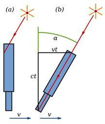 Keywords: Stellar aberration.svg en If a telescope is travelling at high speed only light incident at a particular angle can avoid hitting the walls of the telescope tube Own Inductiveload 2009-03-11 Stellar aberration