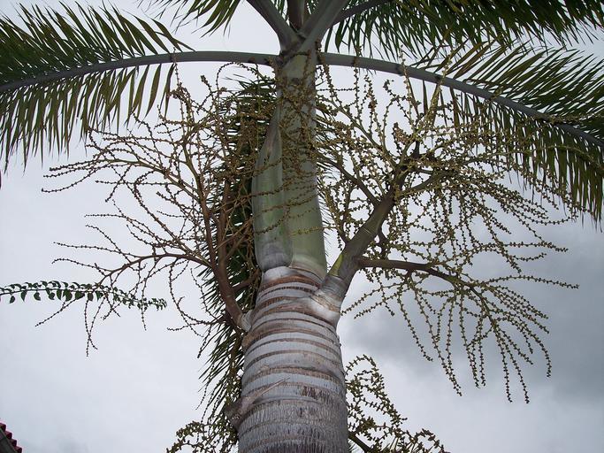Keywords: Stemcrownshaftinflorescenceandprophyll.JPG en Trunk crownshaft and inflorscences Own Mmcknight4 2008-08-31 Wodyetia bifurcata