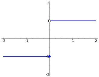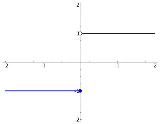 | Keywords: Step function, 1 if x less than 0, -1 if x less than or equal to 0.svg Created with Sage en The step function <math>k x \left\ \begin matrix 1 \mbox if x > 0 \\ -1 \mbox if x \le 0 \end matrix \right </math> similar to the signum function Created using the following Sage code <source lang python>def k x if x > 0 return 1 return -1 plot k xmax 2 xmin -2 ymax 2 ymin -2 exclude 0 thickness 2 5 + point 0 -1 size 80 zorder 4 + point 0 1 size 80 faceted True rgbcolor 'white' zorder 4 </source> 2012-03-13 own Eviatar Bach cc-zero Uploaded with UploadWizard Step functions Images with Sage source code Files by User InverseHypercube |