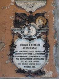 Keywords: Stephenson Torino Porta Nuova.jpg it Targa monumentale dedicata dagli italiani a George e Robert Stephenson nel cinquantenario 1880 dell'inaugurazione della linea ferroviaria Liverpool-Manchester 1830 La targa è murata sotto il portico orientale della stazione ferroviaria di Torino Porta Nuova lato via Nizza Monumental plaque dedicated by the Italians to George and Robert Stephenson in the fiftieth anniversary 1880 the opening of the railway line Liverpool-Manchester 1830 The plate is walled in the eastern portico of the railway station of Torino Porta Nuova Nizza street side own Nprinetti 2009-01-30 45 3 42 98 N 7 40 45 07 E region IT Plaques in Turin Torino Porta Nuova train station George Stephenson Robert Stephenson turin Monuments and memorials in Turin Plaques installed in 1880 Taken with Panasonic Lumix DMC-LS60 |