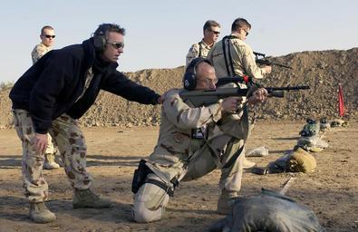 Keywords: Steyr AUG DF-SD-06-01775.jpg Range officer Corporal CPL Greg Maxted left Australian Air Traffic Control ATC Detachment DET Task Unit 633 4 2 teaches Special Agent Peter Davis 447th Office of Special Investigations OSI how to fire a F88 5 56 mm Weapon System at the Baghdad International Airport firing range Baghdad Iraq during Iraq War Operation IRAQI FREEDOM http //www dodmedia osd mil/Assets/2006/Air_Force/DF-SD-06-01775 JPEG 2003-12-04 SSGT STACY L PEARSALL USAF PD-USGov Kneeling men Males with assault rifles Baghdad in the Iraq War Shooting Steyr AUG Shooting ranges Iraq Air Force Office of Special Investigations Military history of Australia during the Iraq War |
