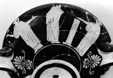 Keywords: Stieglitz Painter - Kylix with Youths and Women - Walters 4890 - Side A Detail.jpg This red-figure kylix depicts a youth or a woman to the left on the tondo The figure wears a chiton and mantle and stands before a pillar A sakkos hangs on the right On the front are two women and a youth On the left a woman stands frontally looking right She holds out both hands gesturing to another woman on the far right who stands before a pillar facing left right arm extended Both wear a chiton mantle and sakkos In the center is a mantled youth who stands in profile to the right On the back three youths are depicted The one on the left stands frontally while looking right Above on the left is an ivy leaf A second mantled youth stands in profile to the right before a pillar between him and the third mantled youth who faces left A flute case hangs between the first and second youths The mantles of all three are pulled up around their necks; the last's extends over part of his head The sex of the figure in the tondo is unclear and perhaps the painter himself forgot or changed his mind halfway through completing the figure The dress and sakkos speak in favor of a woman the head and stele for a youth ca 450 BC Classical terracotta H with handles 3 9/16 x Diam with handles 11 3/4 in 9 x 29 8 cm ; Diam at mouth cm 22 6 ; Diam at foot cm 8 7 accession number 48 90 24497 Don Marcello Massarenti Collection Rome 1897 cat no 240 Henry Walters city Baltimore Walters Art Museum Henry Walters Acquired by Henry Walters with the Massarenti Collection 1902 place of origin Attica Greece Walters Art Museum license Ancient Greek red-figure pottery in the Walters Art Museum Stieglitz Painter Media contributed by the Walters Art Museum needs category review Media contributed by the Walters Art Museum needs artist update |