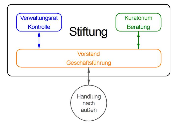| Keywords: Stiftungsorgane.png de Beispiel für eine Stiftung mit drei Stiftungsorganen Ein Vorstand orange führt die Geschäfte und vertritt die Stiftung nach außen und nach innen ein Verwaltungsrat blau kontrolliert den Vorstand und ein Kuratorium grün berät den Vorstand own Membeth 2016-07-18 Foundations organizations Cc-zero |