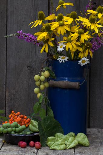 Keywords: still life milk can pot fruit yellow coneflower