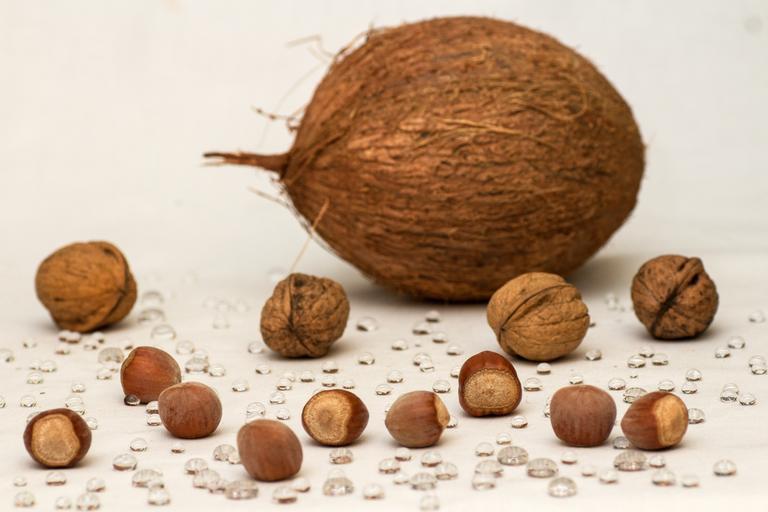 Keywords: still life nuts walnuts hazelnuts coconut drop of water
