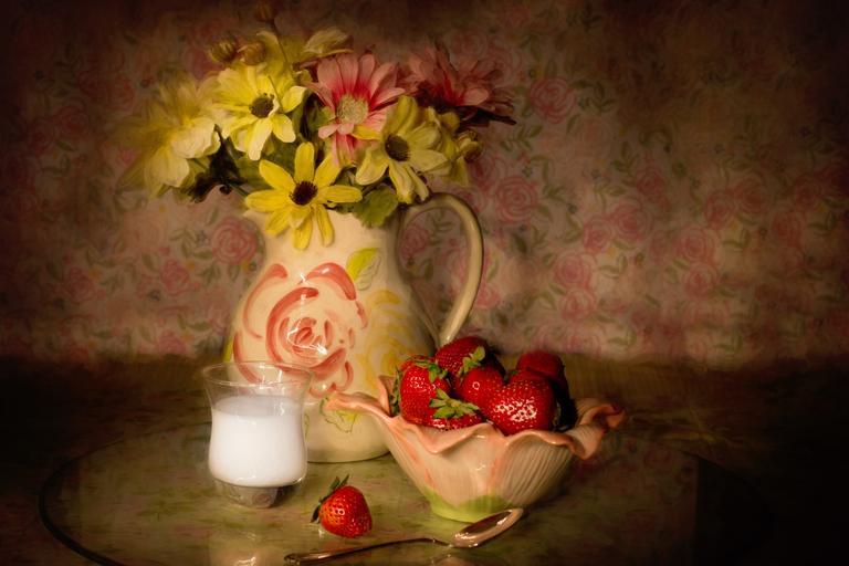 Keywords: still-life strawberries in a bowl cream table setting