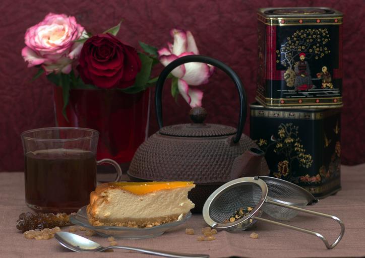 Keywords: still life tee pot teapot tea tins cake roses