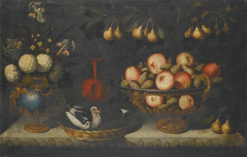 Keywords: Still Life with Flowers in Vase, Apples & Pears by Bernardo Polo.jpg en Still Life with Flowers in a Gilt-Mounted Bluestone Vase and a Bowl of Apples with a Sprig of Pears by Bernardo Polo c 1650-75 oil on canvas 73 by 112 cm Sotheby's Bernardo Polo c 1650-75 Bernardo Polo PD-old-100 |