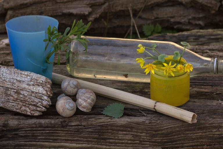 Keywords: still life wooden board bottle flowers light snail shells